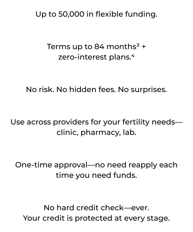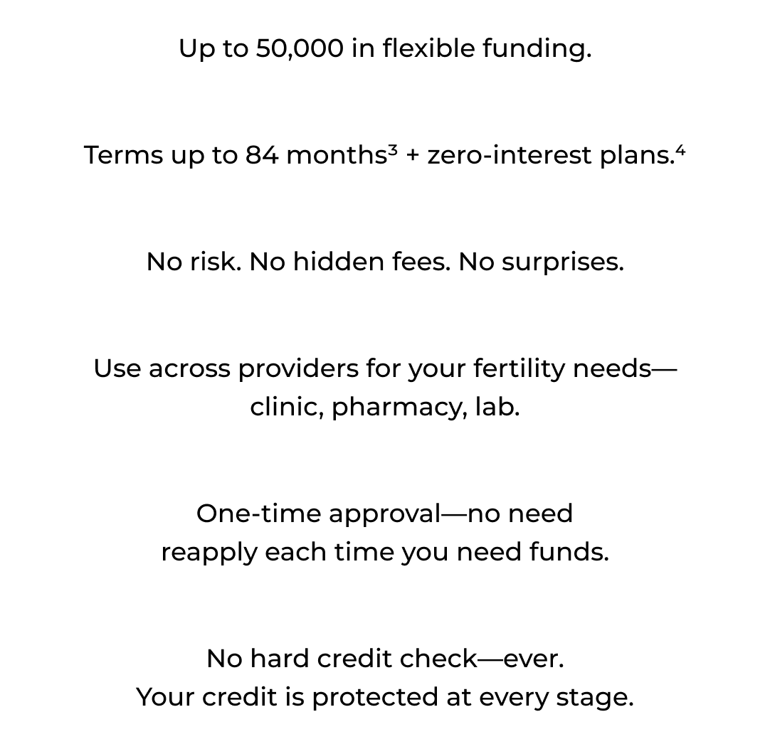 With just one quick application, you’ll have flexible spending power to support your entire fertility journey—without ever needing to reapply.